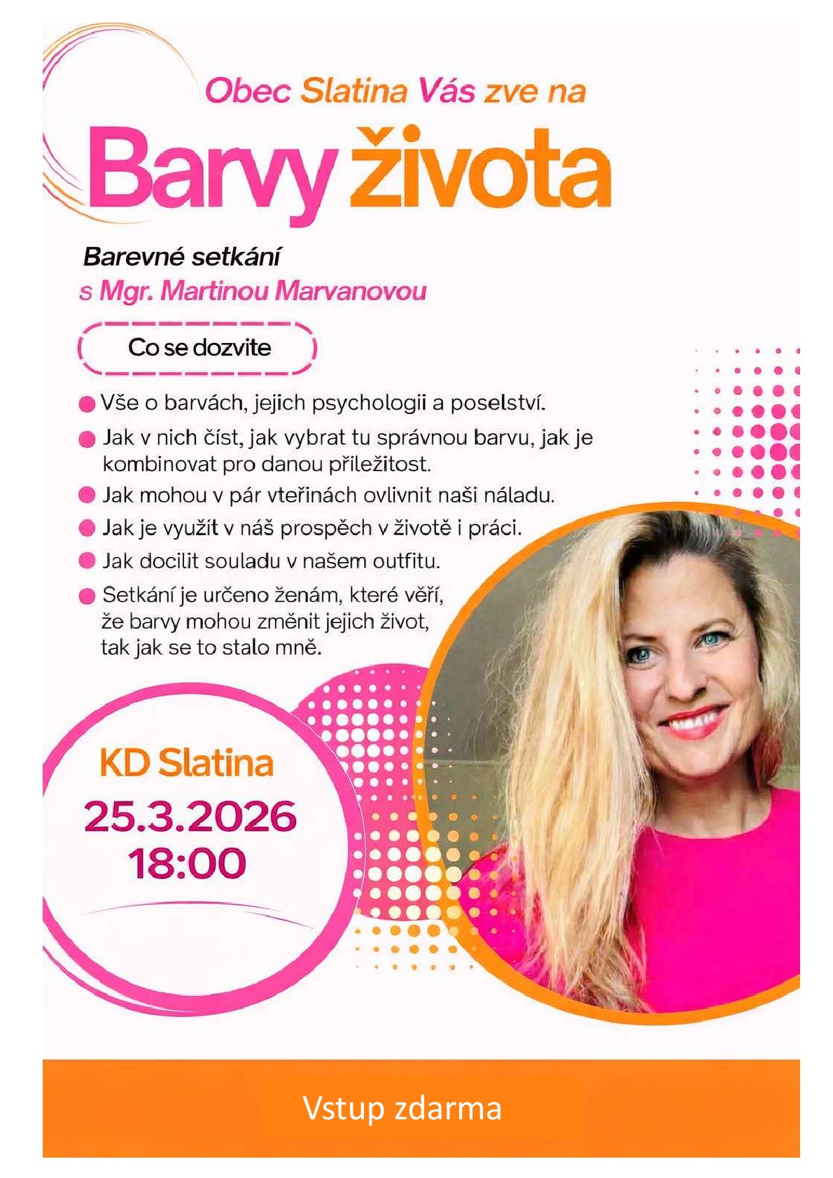 Ve středu 25.3.2026 v 18 hodin se v přísálí kulturního domu ve Slatině uskuteční Barevné setkání s Mgr. Martinou Marvanovou, somatickou koučkou, terapeutkou tělesných impritů a facilitátorkou. Dozvíte se:
