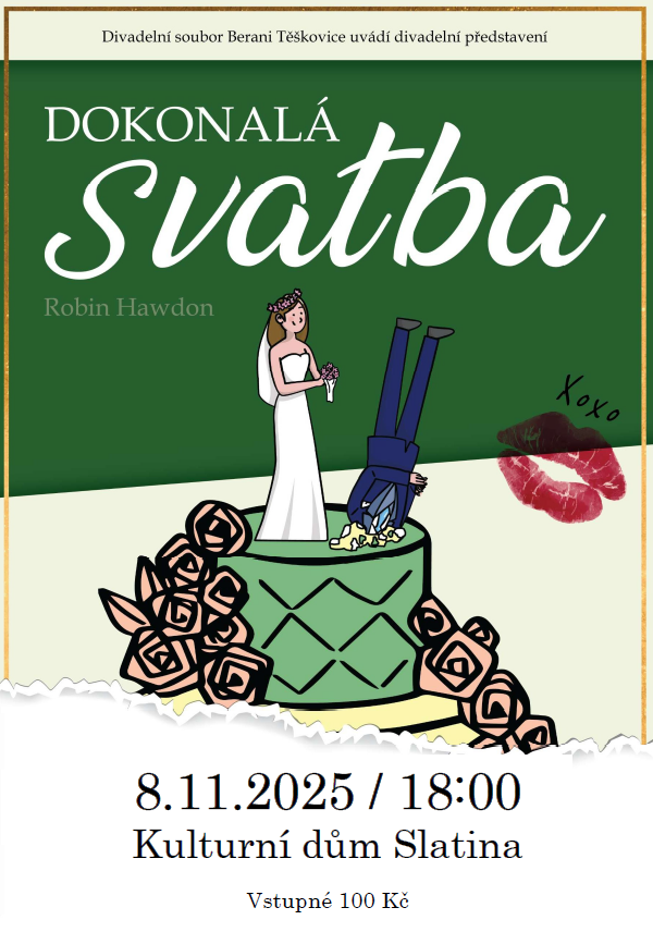 V sobotu 8.11.2025 v 18 hodin se můžete těšit na divadelní soubor Berani Těškovice, kteří uvedou divadelní představení s názvem DOKONALÁ SVATBA. Vstupné je 100 Kč.