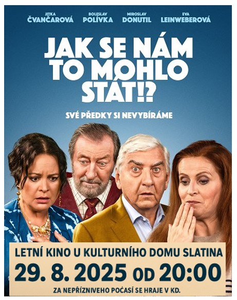 V pátek 29.8.2025 ve 20 hodin u KD Slatina se bude promítat film JAK SE NÁM TO MOHLO STÁT!? Občerstvení je zajištěno. Vstupné je volné. Za nepříznivého počasí se bude promítat v KD Slatina.