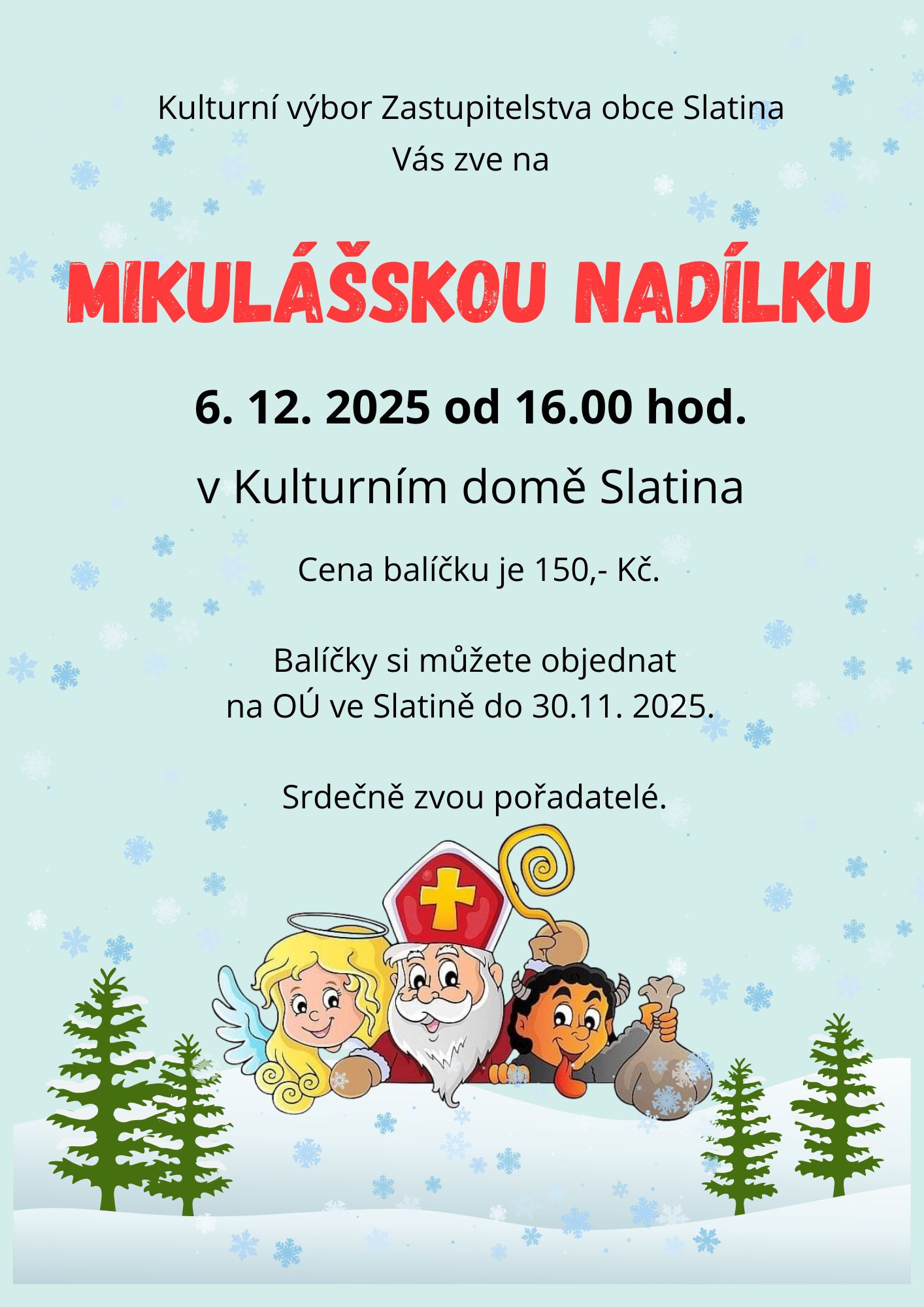 V sobotu 6.12.2025 od 16 hodin se můžete těšit na Mikulášskou nadílku, která se koná v KD Slatina. Balíčky si můžete objednat na OÚ ve Slatině do 30.11.2025, cena balíčku je 150 Kč.
