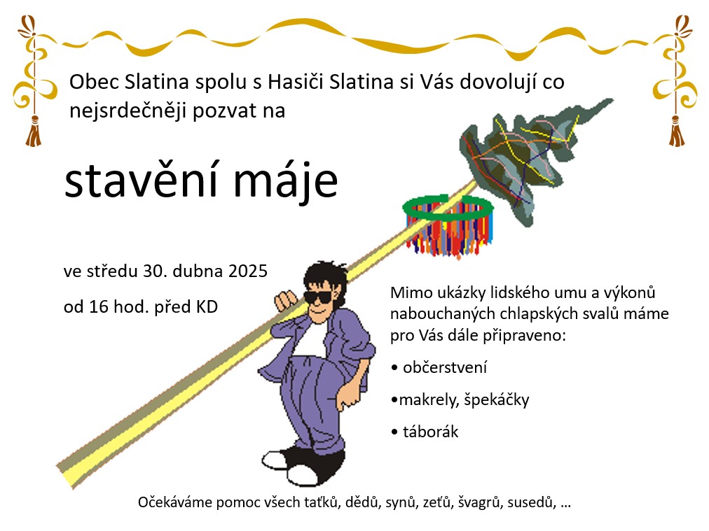 Obec Slatina spolu s Hasiči Slatina si Vás dovolují pozvat na STAVĚNÍ MÁJE dne 30. dubna 2025 od 16 hod. před KD. Mimo ukázky lidského umu a výkonů nabouchaných chlapských svalů je pro Vás připraveno bohaté občerstvení a táborák. Očekáváme pomoc všech taťků, dědů, synů, zeťů, švagrů, sousedů...
